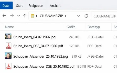 Am Ende die Dokumente auch gern zu einer ZIP-Datei komprimieren und dann mit dem Clubnamen abspeichern und gesammelt (mit dann allen Aktiven drin) versenden à CLUBNAME.ZIP